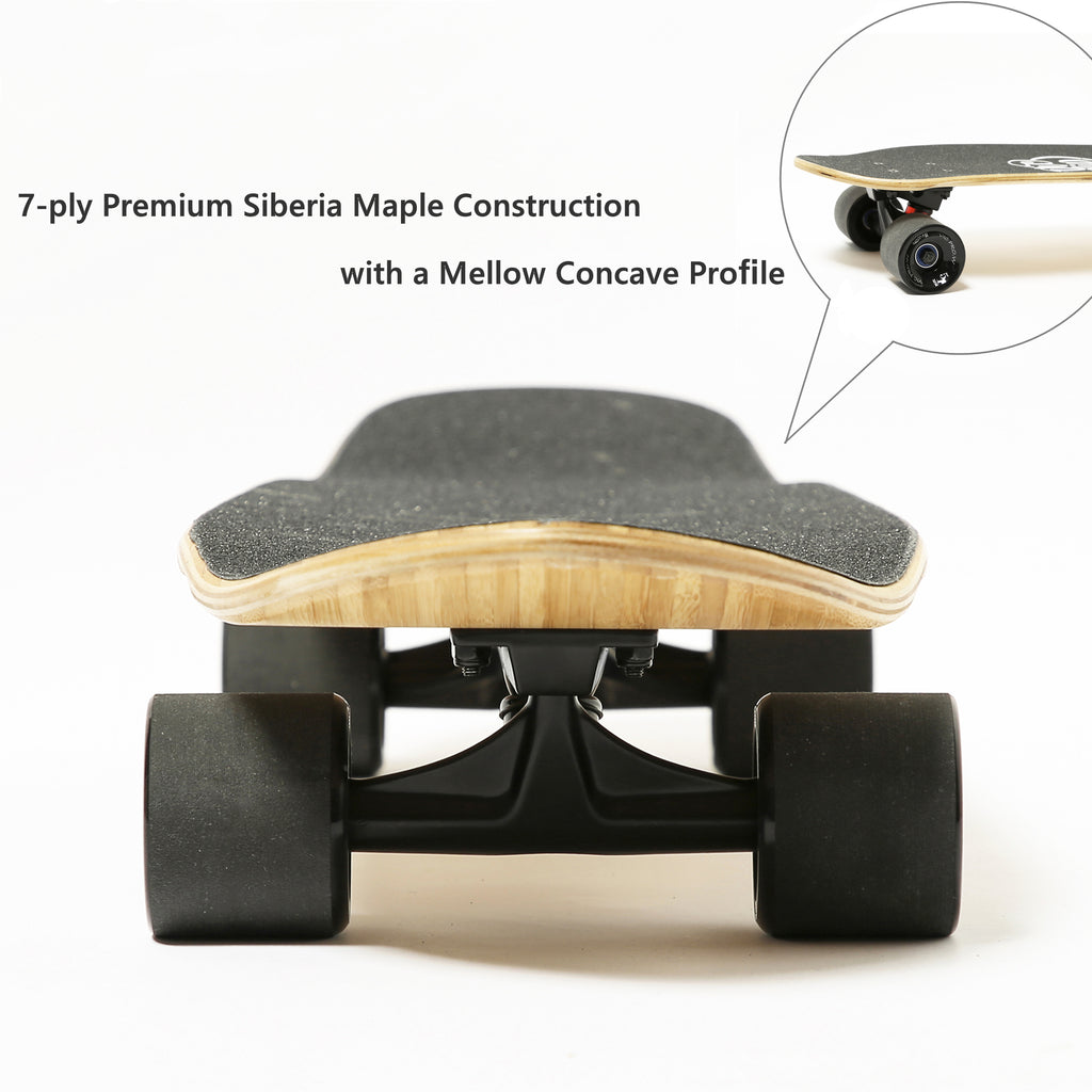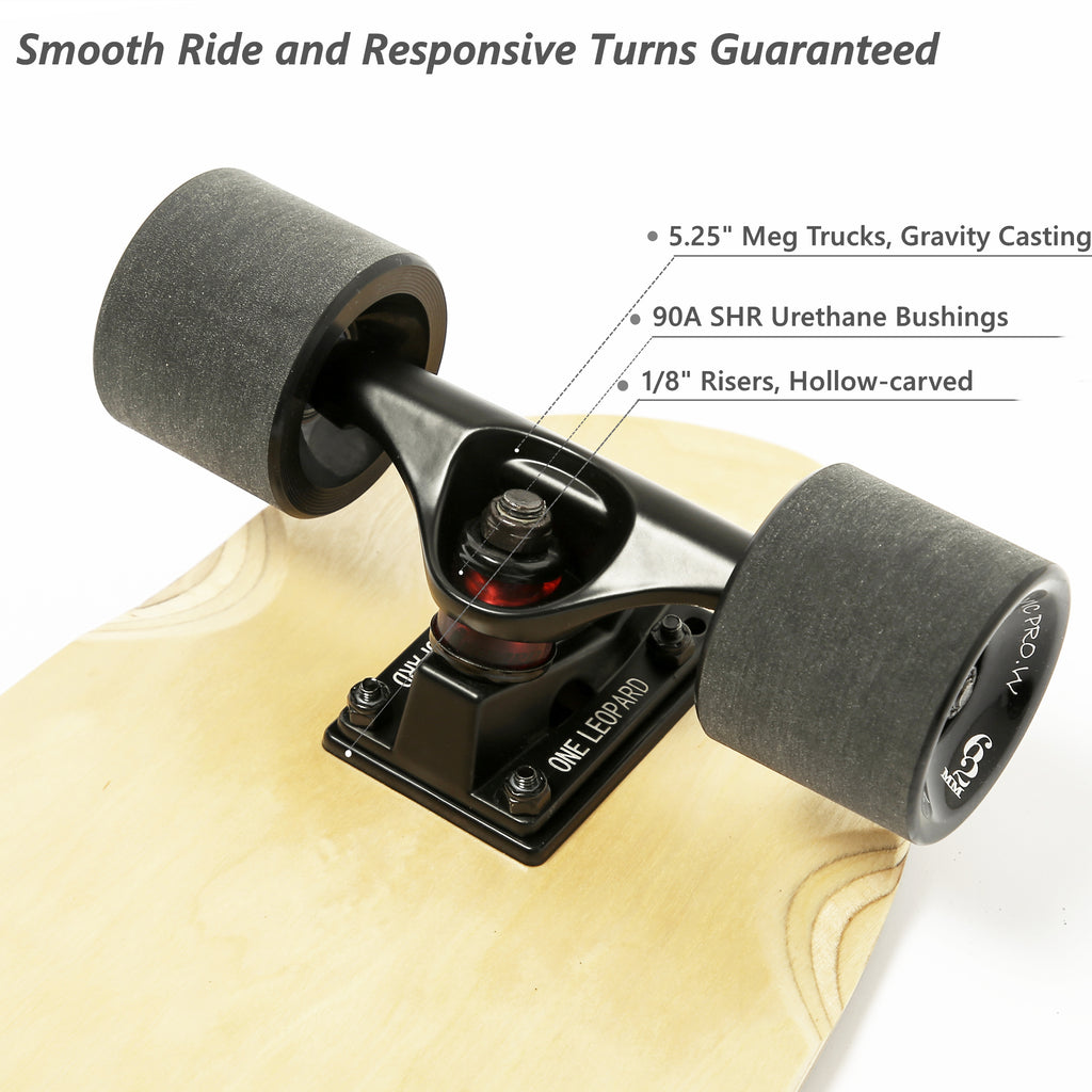 - šćSTURDY & STRONGćThe deck features classic 7-ply construction and is made of premium Siberia maple; its slow growth in the bitter cold region makes the deck durable and stable. The 5.25" MEG Trucks are crafted via Gravity Casting, which means fewer air bubbles and a more consistent metal density than cheaper Die Casting trucks used by others. The trucks also feature a high grade "Hammer in" Kingpin with an angle of 55 degrees for a safer cruise.